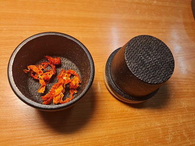 Sušenou papriku se nepovede drtit v hmoždíři (tedy drtit možná ano, ale ne na jemno), rozdrobení v ruce taky není ideální a kontaminuje prsty. Možná by bylo dobré zkusit opakovaně použitelný mlýnek na koření. Moje verze je litinový mlýnek, který je dokonalý mimo jiné v tom, že dá se jednoduše umýt a používat na různé druhy paprik a koření.