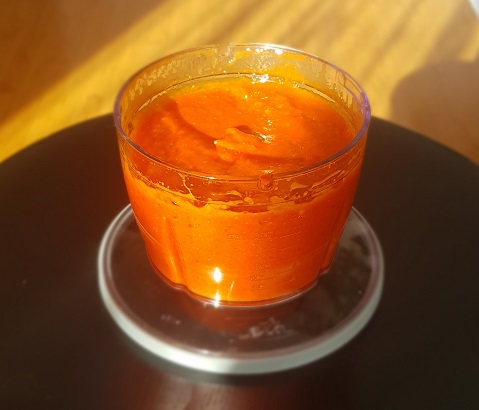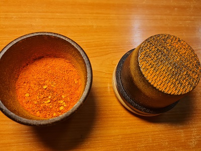 Z druhého obrázku je patrné, jak jemně je paprika namletá, opatrnost je na místě. Poměrně rychle zamoří přilehlé místnosti. Je to Habanero, před sušením nakrájené na kolečka. Výsledek několika pootočení mlýnku.